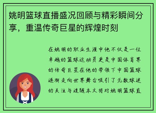 本文旨在探讨阿巴斯对姚明的深情回忆,特别是姚明对中国篮球所产生的巨大影响及其在阿巴斯个人成长中的重要作用。文章将从四个方面进行详细阐述:姚明作为中国篮球的代表性人物、他的职业生涯如何激励年轻球员、他对中国篮球文化的塑造,以及他在国际舞台上的贡献与影响。通过这些方面,我们不仅能更好地理解姚明的伟大,也能够看到阿巴斯作为一名运动员,在姚明的引导下如何不断成长,并为中国篮球的发展贡献自己的力量。 1、...